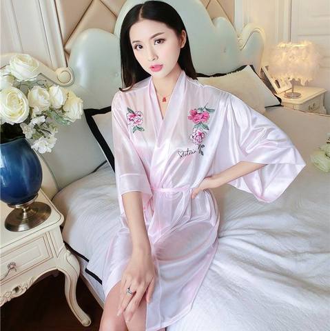Bata Kimono de satén para mujer, bata de baño de manga de siete puntos con espalda con cuentas para primavera Otoño, camisón transpirable informal